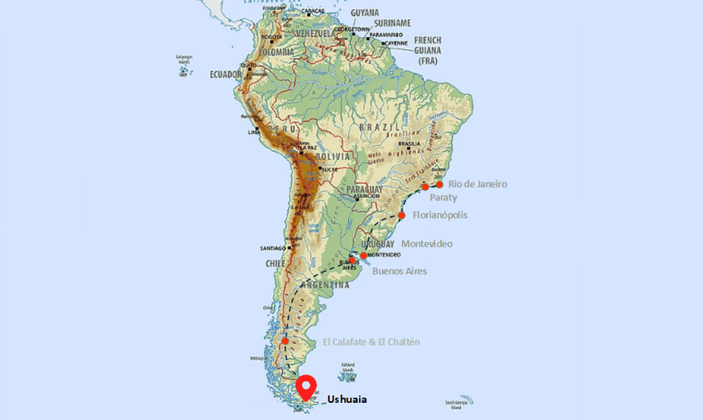 Ushuaia on maailman eteläisin kaupunki ja siellä todellakin tuntee olevansa maailman äärilaidalla. Se on hyvin pieni, lumihuippuisten vuorien ja Beaglensalmen kehystämä kaupunki Argentiinan puolella Tulimaata. Siitä etelään on enää alle 3000 asukkaan Puerto Williams ja heti seuraavana onkin Antarktis. Beaglensalmea tujotellessa voi hyvin kuvitella katselevansa maailman laitaa kohti. Ushuaia tuntui mielestäni kovin harmaalta ja lohduttomalta, enkä saanut karistettua pientä ahdistusta päältäni. Tunteeseen vaikuttivat todennäköisesti monet tekijät, kuten rankka matka ja ensimmäisen päivän sähkökatko koko kaupungissa, joten suosittelen silti käymään siellä. Maisemat Tulimaassa ovat nimittäin vertaansa vailla.